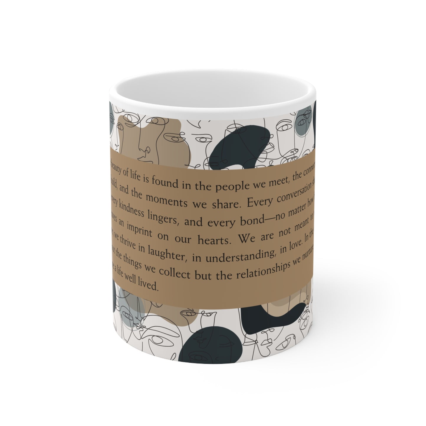 Sip your favourite drink with a daily reminder of what truly matters—connection, kindness, and the people we cherish. This beautifully designed mug features an original quote about the power of human relationships, set against a striking abstract face illustration. Perfect for your morning coffee, tea, or a moment of reflection, this mug makes a thoughtful gift for anyone who values deep connections and meaningful conversations.