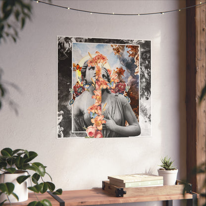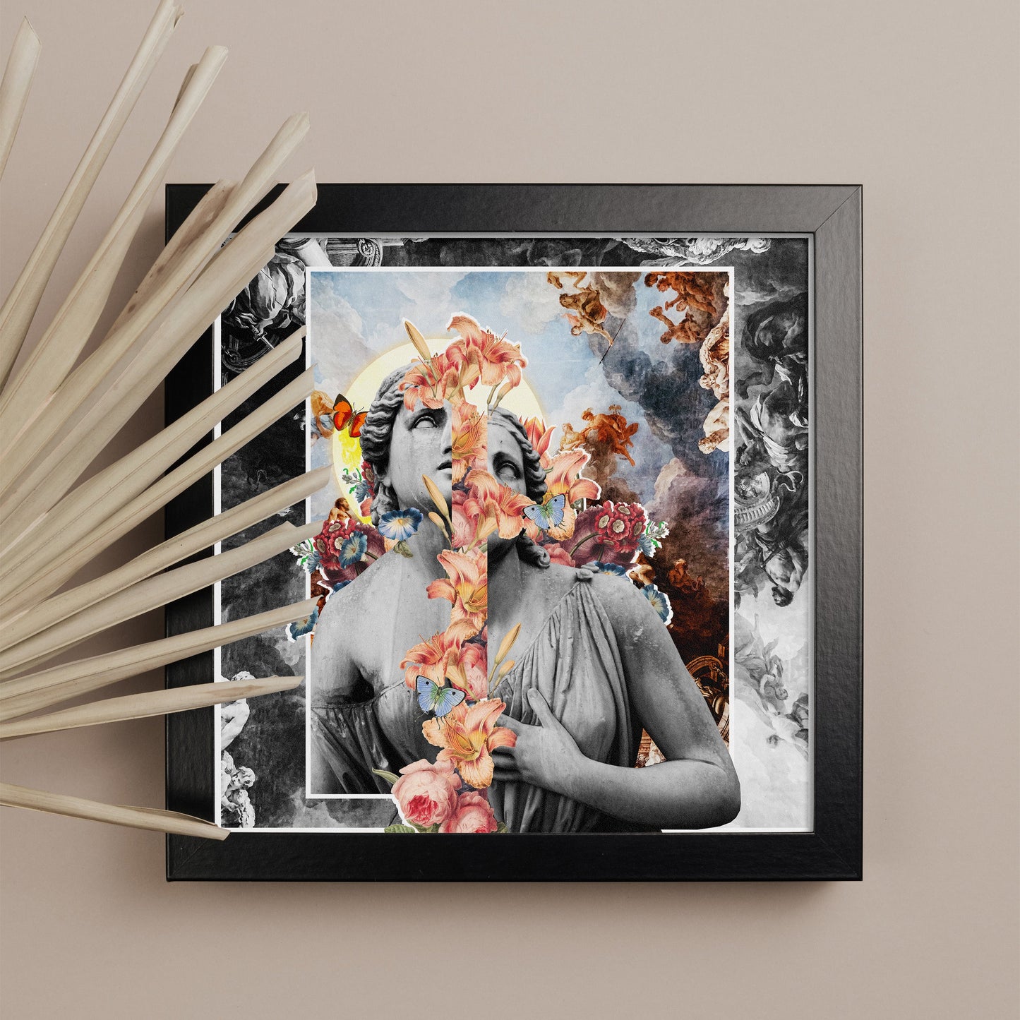 A mesmerizing fusion of classical sculpture, baroque art, and botanical surrealism. "Evolve" reimagines a timeless marble statue, delicately fragmented and blooming with vibrant lilies, roses, and butterflies. A golden halo radiates behind, contrasting with stormy Renaissance skies, symbolising transformation, growth, and rebirth. The interplay of grayscale and vivid color brings an ethereal balance between past and present, decay and renewal.