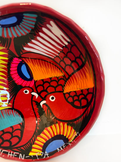 Add a pop of colour and tradition to your space with this hand-painted Red Mexican Decorative Bowl. Crafted from ceramic and sourced from local artisans in Mexico, this bowl features an intricate design of two vibrant birds, with Chichen Itza - Mexico inscribed on the inside. Perfect as both a functional dish and a stunning decorative piece, it makes a unique addition to your dining collection or a charming accent in any room. This handcrafted bowl brings a touch of tradition and cultural flair to any setting.